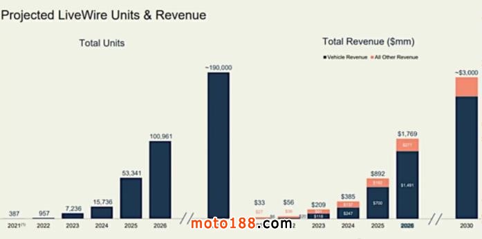 與銷量相對應的銷售額也成正比大幅增加,預計到2026年,摩托車的銷售額將達到14.91億美元,另外還有2.77億美元是與LiveWire相關的“所有其他收入”。到2030年,銷售額預測將達到30億美元,不過沒有細分比重。